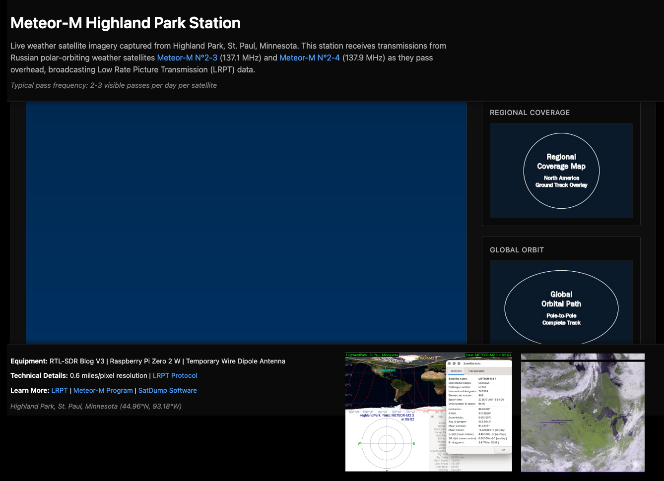 Current Satellites: Meteor-M N°2-3 (137.1 MHz) and Meteor-M N°2-4 (137.9 MHz). Typical coverage: 2-3 visible passes per day per satellite over Minneapolis-St. Paul area. (Built off of a previous project, creating an aircraft location receiver.)