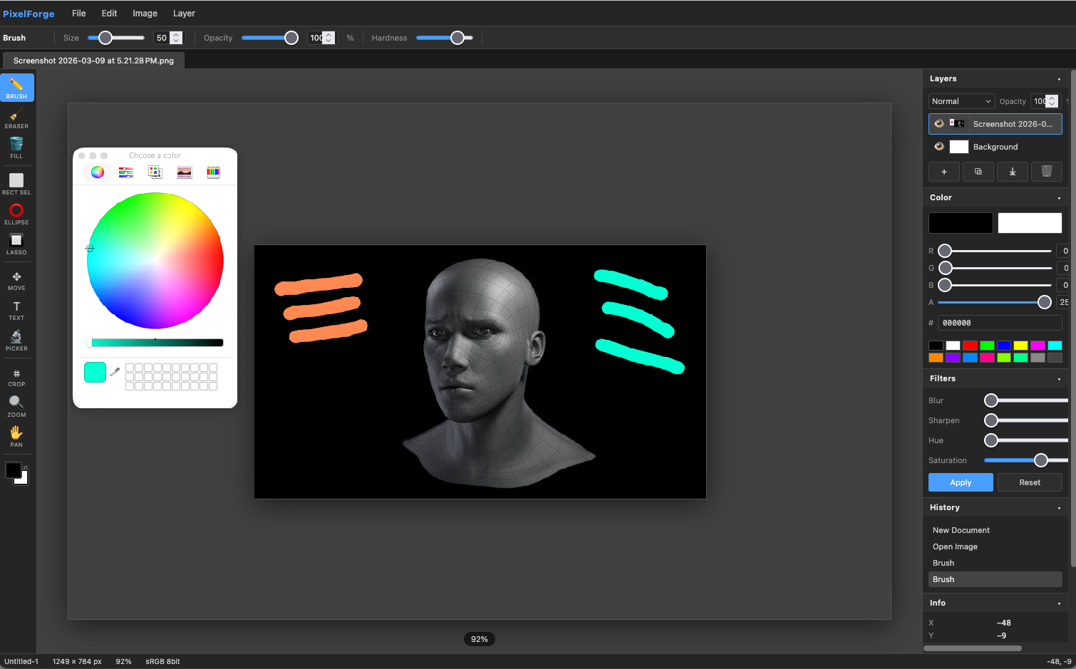 A fully client-side image editor built on the Canvas API, featuring layers, blend modes, a filter panel, and core tools like brush, fill, lasso selection, and crop. No server required — everything runs in the browser with zero dependencies.