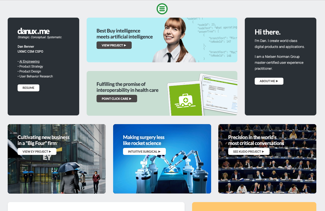 The projects above are recent AI experiments. My full portfolio covers 10+ years of UX strategy, product design, and research across healthcare, retail, enterprise, and Fortune 500 clients.