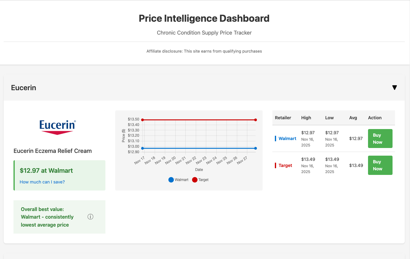 Price History Companion helps consumers take control of purchasing decisions by tracking actual price history across major retailers. Instead of relying on retailer "sale" claims or algorithmic pricing manipulation, users build their own intelligence about what products really cost over time. The system compares current prices against historical averages to reveal when a "deal" is genuine versus artificially created. This is especially valuable for people with chronic conditions who need specific products regularly—giving them the confidence to buy strategically rather than reactively based on marketing perception.