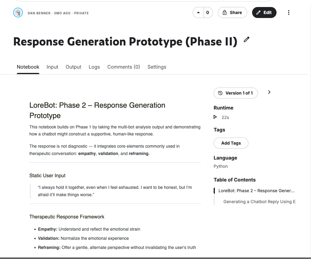 This notebook builds on Phase I by taking the multi-bot analysis output and demonstrating how a chatbot might construct a supportive, human-like response. The response is not diagnostic—it integrates core elements commonly used in therapeutic conversation: empathy, validation, and reframing.