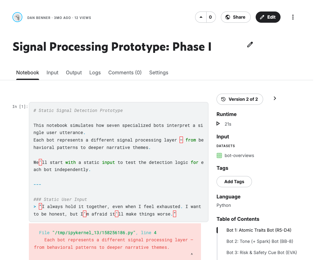Each agent operates independently to detect specific signals in user language, creating a rich composite understanding that can inform conversational flow, support appropriate pacing, and recognize moments of growth, risk, or insight.