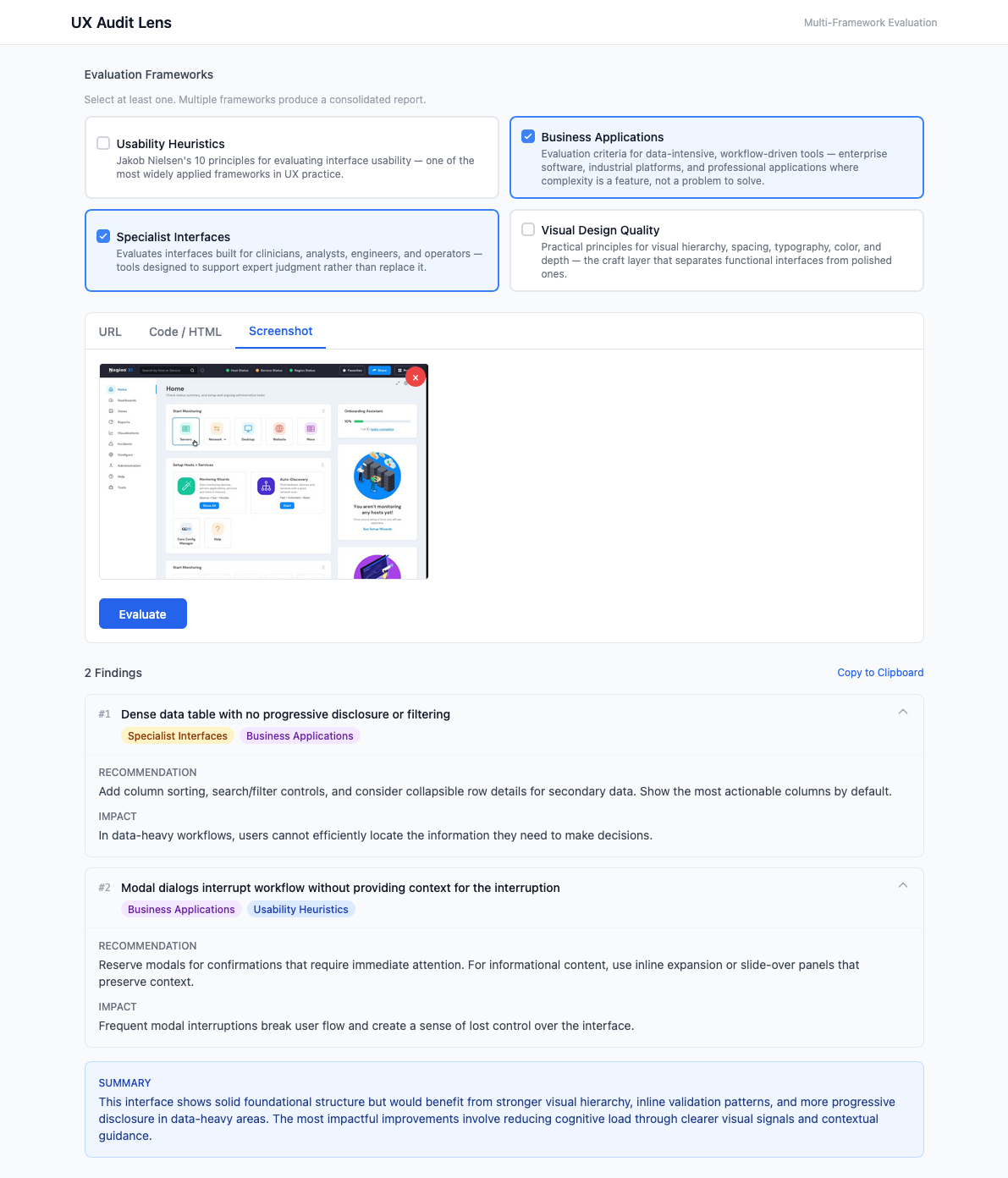 Most design reviews rely on gut feel or a single checklist. UX Audit Lens runs your interface through multiple UX frameworks at once — paste a URL, upload a screenshot, or drop in code — and returns findings tagged by evidence-based principles drawn from established UX research and standards.