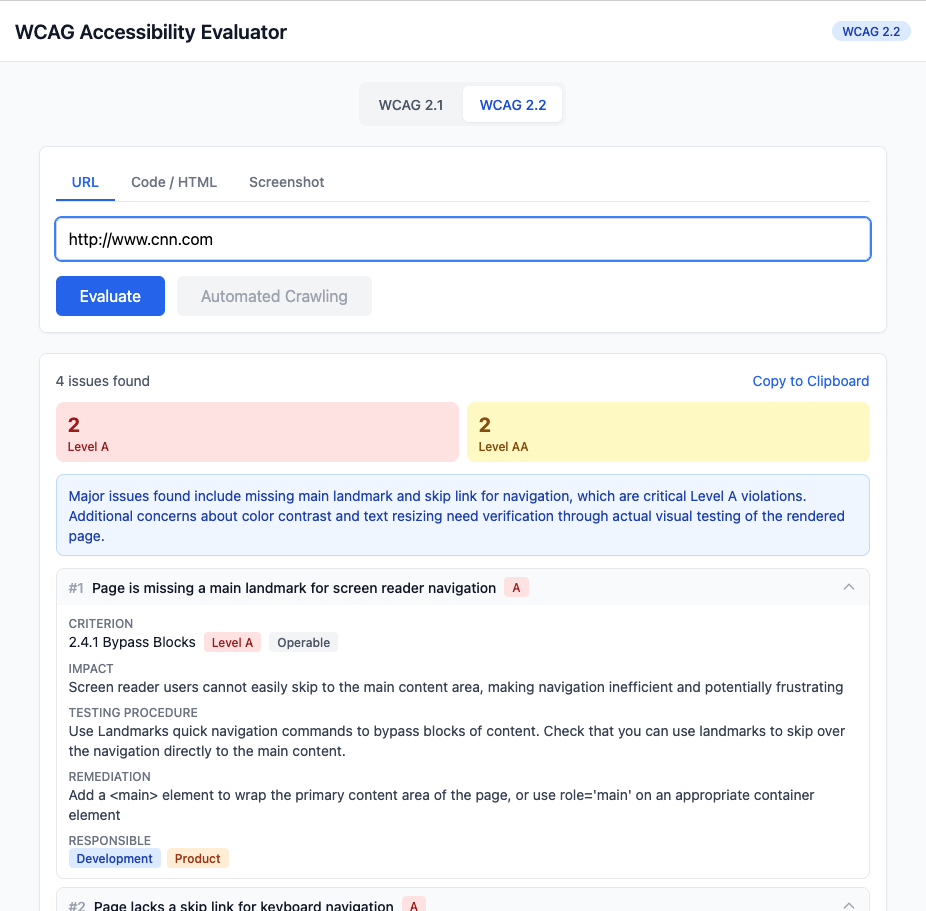 A comprehensive AI-powered accessibility evaluator that goes beyond automated checkers catching only contrast and alt text issues. While most tools identify 30% of problems, this evaluator covers all 86 WCAG 2.2 success criteria across the four core principles—Perceivable, Operable, Understandable, and Robust.