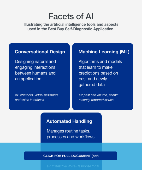 The application leverages three facets of artificial intelligence:The conversational system, puts customers in control, results in greater issue resolution and satisfaction—but the primary goal was to reduce Best Buy Customer Service's Average Handle Time.