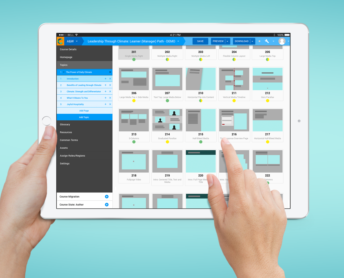 Clients can update text, media, styles pages with a cloud-based course editor. It's hosted on Amazon's S3 server, so global access is seamless and can reach anywhere the internet can go.